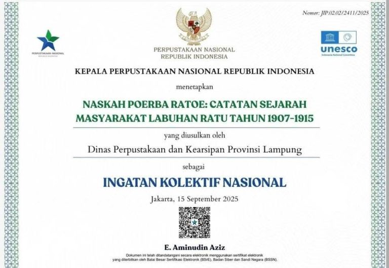 MEDIAPUBLIKA.com – Prestasi membanggakan kembali diraih oleh Provinsi Lampung di kancah nasional. Dua naskah kuno asal Provinsi Lampung berhasil meraih Sertifikat IKON (Ingatan Kolektif Nasional) Tahun 2025 dari Perpustakaan Nasional Republik Indonesia (Perpusnas RI).