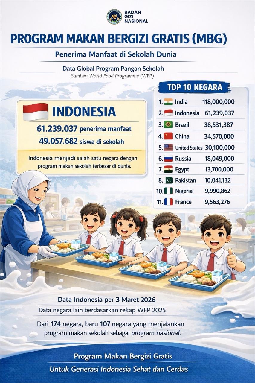 Per 3 Maret 2026, jumlah penerima manfaat Program MBG di Indonesia telah mencapai 61.239.037 orang, dengan 49.057.682 di antaranya merupakan siswa di sekolah, Selasa (10/3/26).